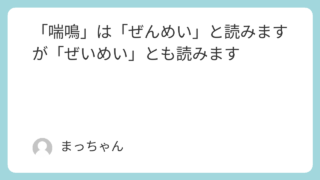 言葉 「喘鳴」は「ぜんめい」と読みますが「ぜいめい」とも読みます 「喘鳴」は「ぜんめい」と読むのが正式です。「ぜいめい」と読まれることも多く,広辞苑には「ぜいめい」の見出しがあり「ゼンメイの訛」とあります。 2025.11.15 言葉